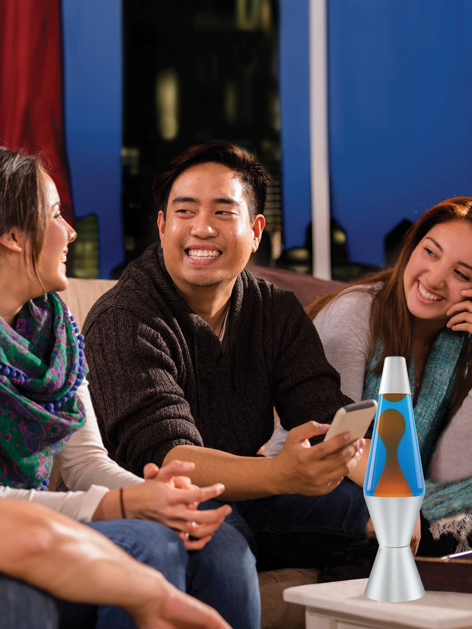 •2117 Is A Classic Lava Lamp With Orange Wax In Blue Liquid And Silver Aluminum Base And Cap